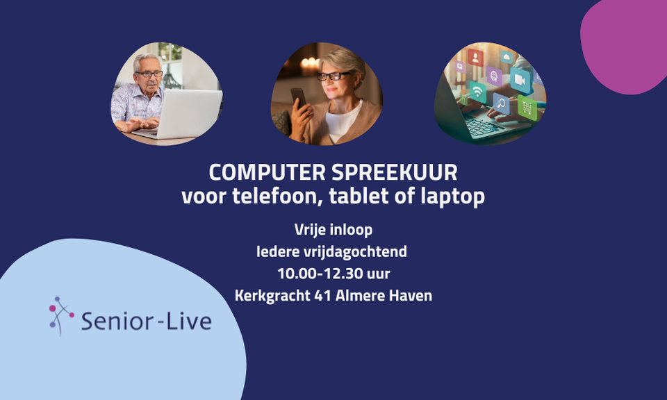 Elke vrijdag van 10.00 tot 12.30 uur staan onze medewerkers voor je klaar tijdens het computer inloopspreekuur bij Senior-Live, Kerkgracht 41-51 in Almere-Haven. Je kunt hier terecht met vragen over je computer, tablet of telefoon. Het spreekuur is bedoeld voor concrete en overzichtelijke vragen die binnen een half uur kunnen worden opgelost. Wanneer de vraag meer tijd en aandacht vraagt, maken we samen een afspraak op kantoor of bij je thuis. Voor het inloopspreekuur geldt een vrijwillige bijdrage. Een afspraak maken is niet nodig, je kunt gewoon binnenlopen.